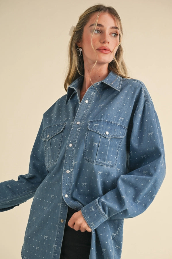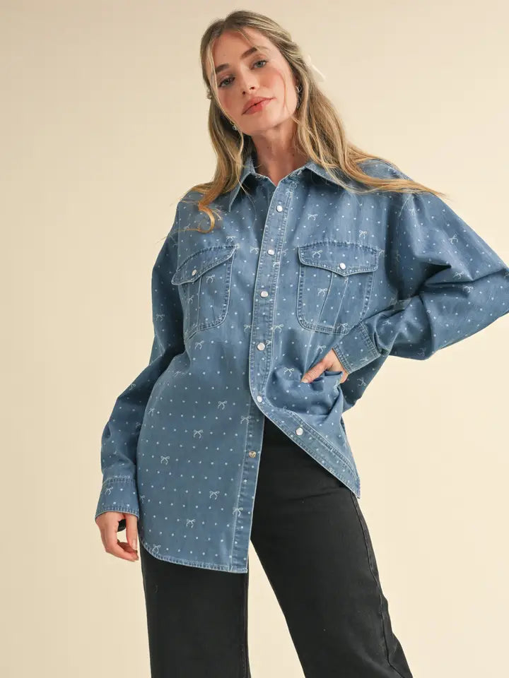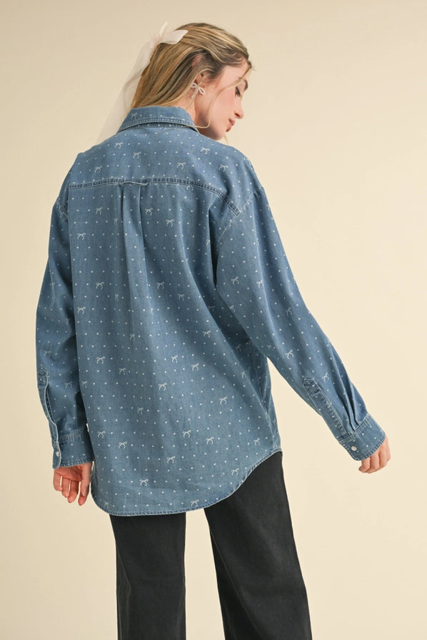 This bow print collared button down shirt will instantly become your next go-to! Woven denim-like fabric, in a ditsy bow print throughout, shapes this shirt that has a collared neckline and cuffed long sleeves. The silhouette has a functional button placket down the center and ends at a high-low shirttail hem. Pair with any pants for a trendy look!