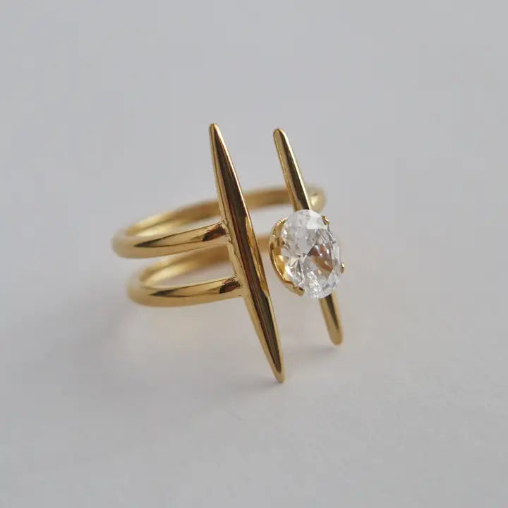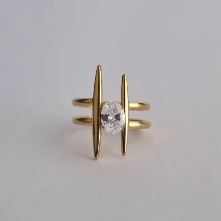 This ring features a striking double-bar design that frames an oval cut zirconia stone. Hypoallergenic and water-resistant, it’s made to be your everyday statement. -stainless steel, 18k gold plated -can be slightly adjusted, best fits size 6-8