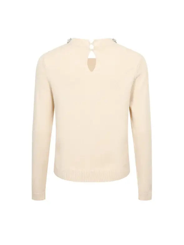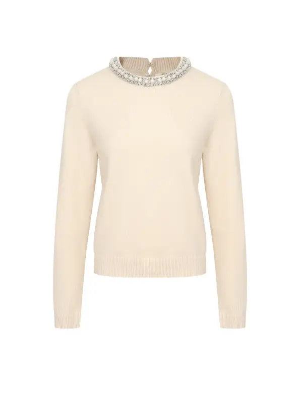This long-sleeve knit top features elegant pearl accents, a back keyhole design, and a secure elastic and button closure for a refined finish.
