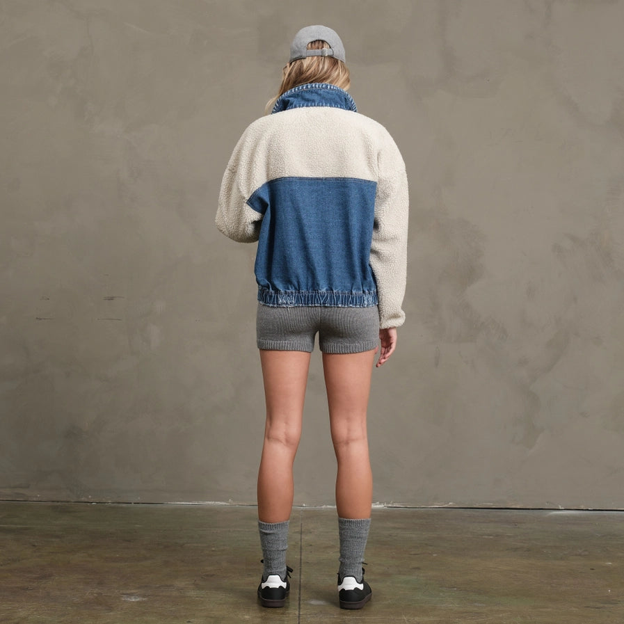 A cozy pullover jacket featuring soft teddy fleece sleeves and top, contrasted with mid-wash denim body.