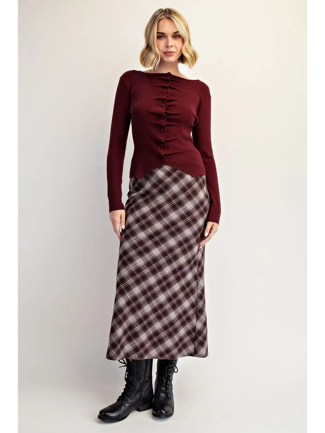 This fitted knit cardigan features a distinctive ruched button-front design for a stylish twist on a classic piece. In a rich brown hue, it’s designed with a crew neckline, long sleeves, and a slightly asymmetric hem, making it perfect for layering over tops or dresses for a chic, elevated look.